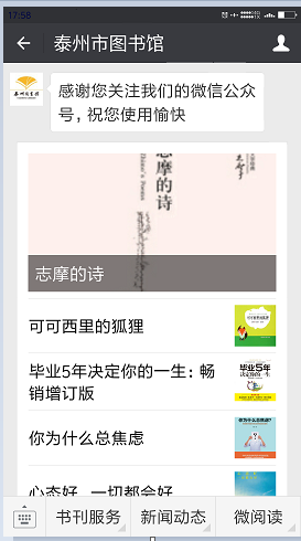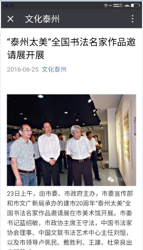(四)建設新媒體發布平臺。2016年開通泰州“微閱讀”和“文化泰州”微信公眾號,泰州市文化館、博物館、海軍誕生地紀念館、美術館在做好單位門戶網站的基礎上,也分別開通微信公眾號,發布各類文化新聞資訊。協助市政府辦完善了設在市圖書館的政務信息公開中心的建設。