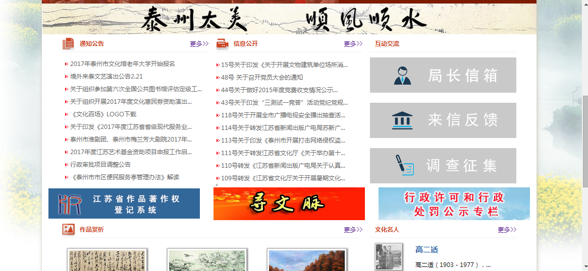 (二)公開公共文化資源信息。圍繞社會熱點組織“文化惠民”、“梅蘭芳藝術節”、“作品賞析”、“尋文脈”等專題報道,主動介紹群眾文化藝術節、全民閱讀等重點文化工作進展情況,設計《關于泰州市全民閱讀的調查問卷》和《關于泰州市基層文化建設情況的調查問卷》等與觀眾進行交流互動。進一步推進權力清單和責任清單公開,及時公示“行政許可和行政處罰”事項。